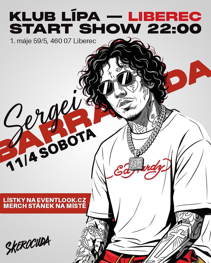 V sobotu 11. dubna 2026 od 22:00 proběhne v Klubu Lípa v Liberci koncert rappera Sergeie Barracudy, jednoho z výrazných jmen české rapové scény. Návštěvníci se mohou těšit na energickou live show a největší hity tohoto ostravského interpreta.